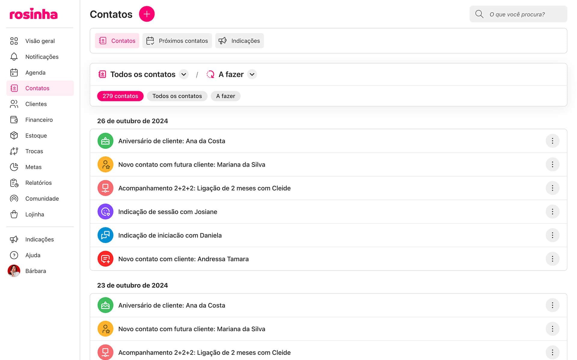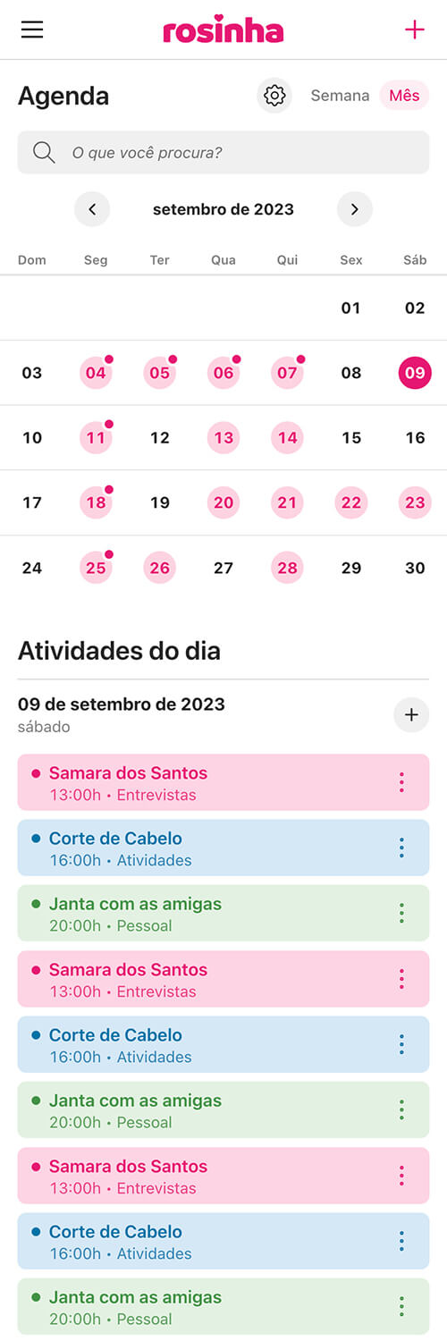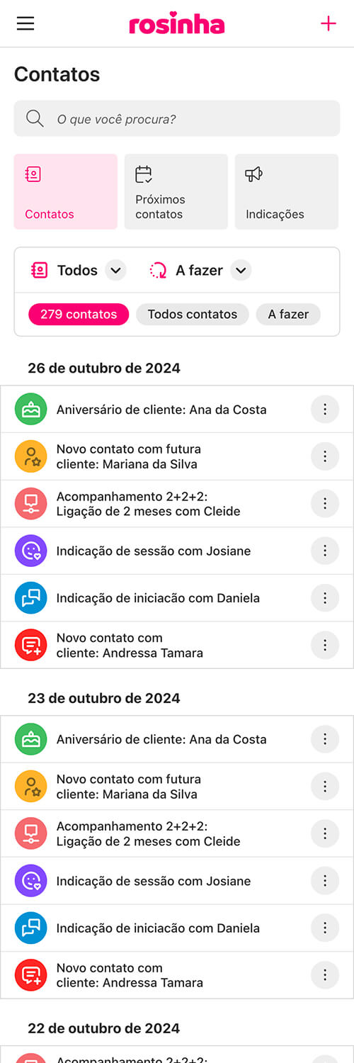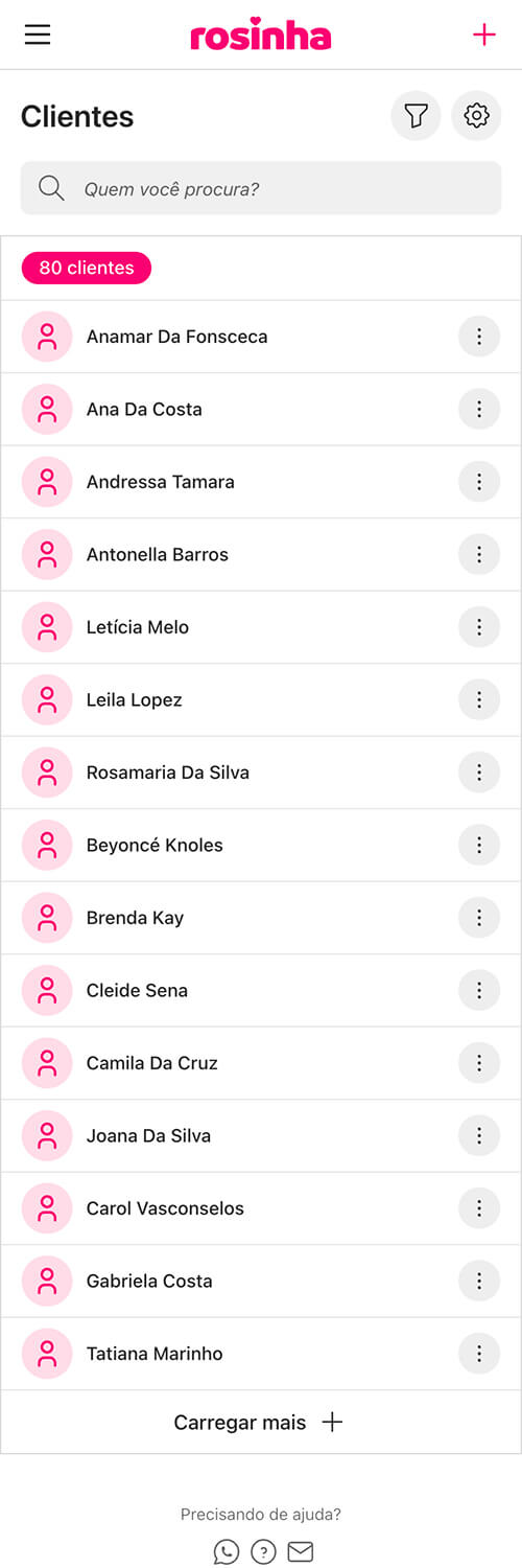 O Rosinha ajuda você a manter tudo organizado em um só lugar para facilitar a comunicação com suas clientes pelo WhatsApp, no momento certo e com mais praticidade. Você mantém o controle do relacionamento, enquanto a plataforma apoia a organização do seu negócio.