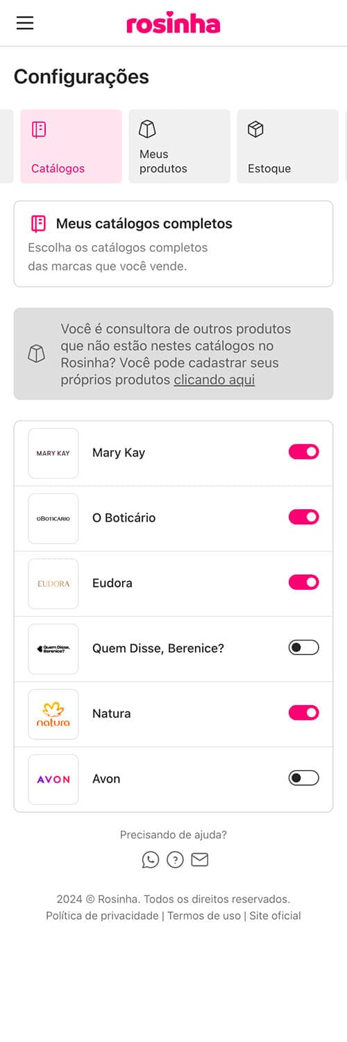 Estamos aqui para te ajudar a descomplicar a organização do seu negócio. Fale com a gente nos canais oficiais ou se tiver acesso ao Rosinha, acesse a seção de ajuda com perguntas e respostas.
